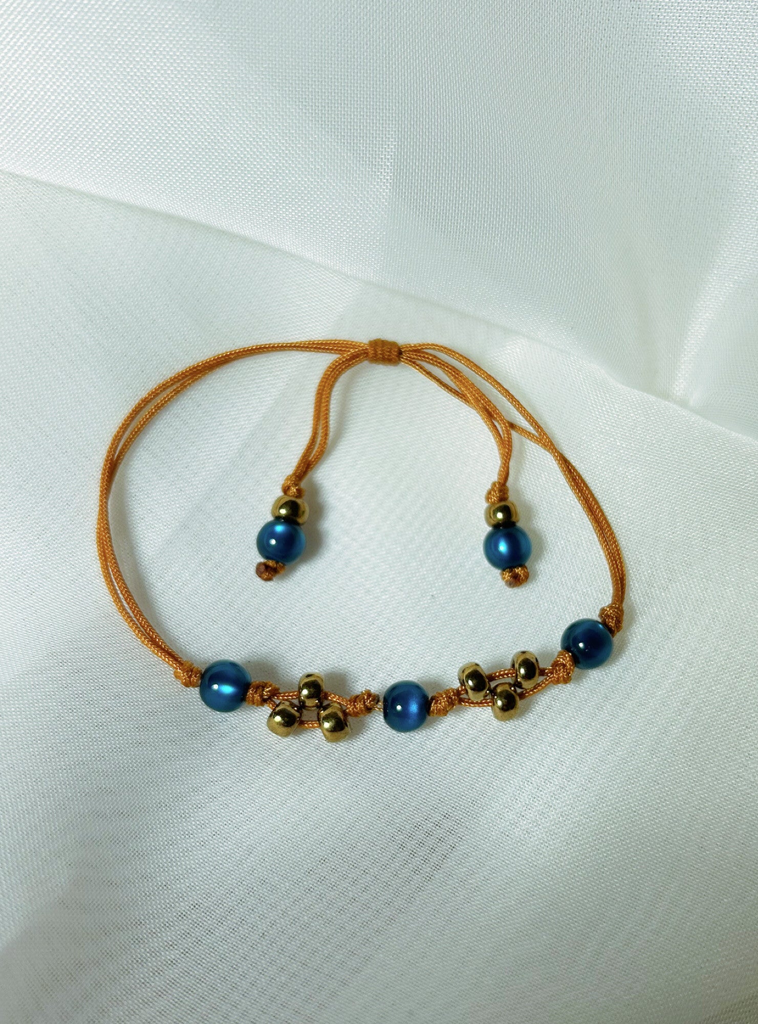 Camelkleurig nylon armbandje met bronskleurige miyuki kralen die speels afgewisseld worden met blauwe glanzende polaris kralen. Het armbandje is afgewerkt met een schuifsluiting.