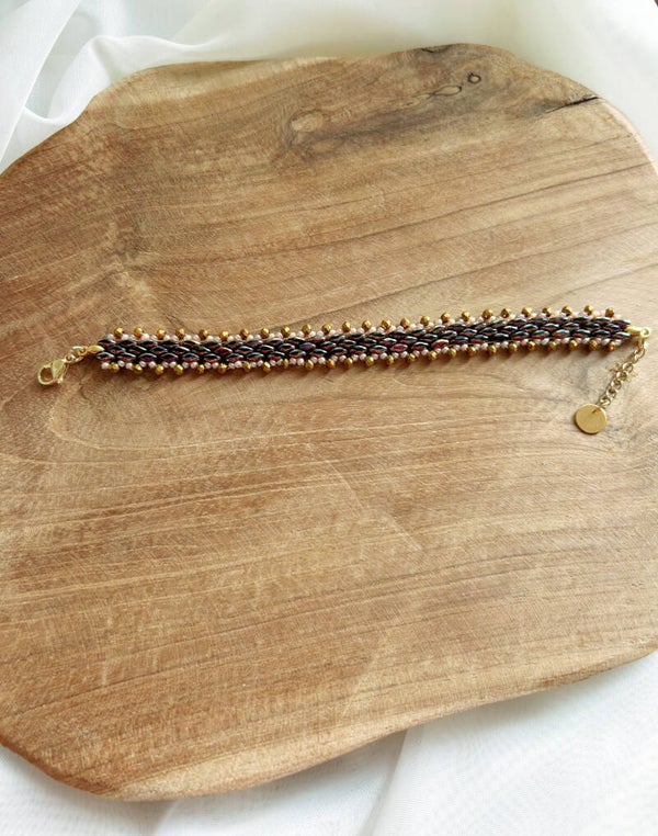 Geregen armband van Tjechische superduo kralen, facetkraaltjes en miyuki rocailles, afgewerkt met een 24k gold-plated (vergulde) sluiting met verlengketting. De lengte van de armband is minimaal 18 en maximaal 20 cm.